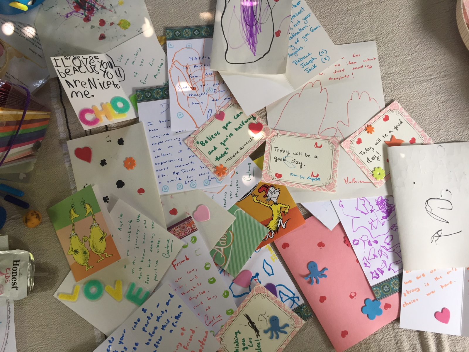 With kids in tow completing any task can be slightly complicated but this was very smooth! The group gathered in the backyard of one of its members, who led this service event, to handwrite and draw inspirational cards to benefit Girls Love Mail – a non-profit organization that sends cards to women who have been recently diagnosed with breast cancer.